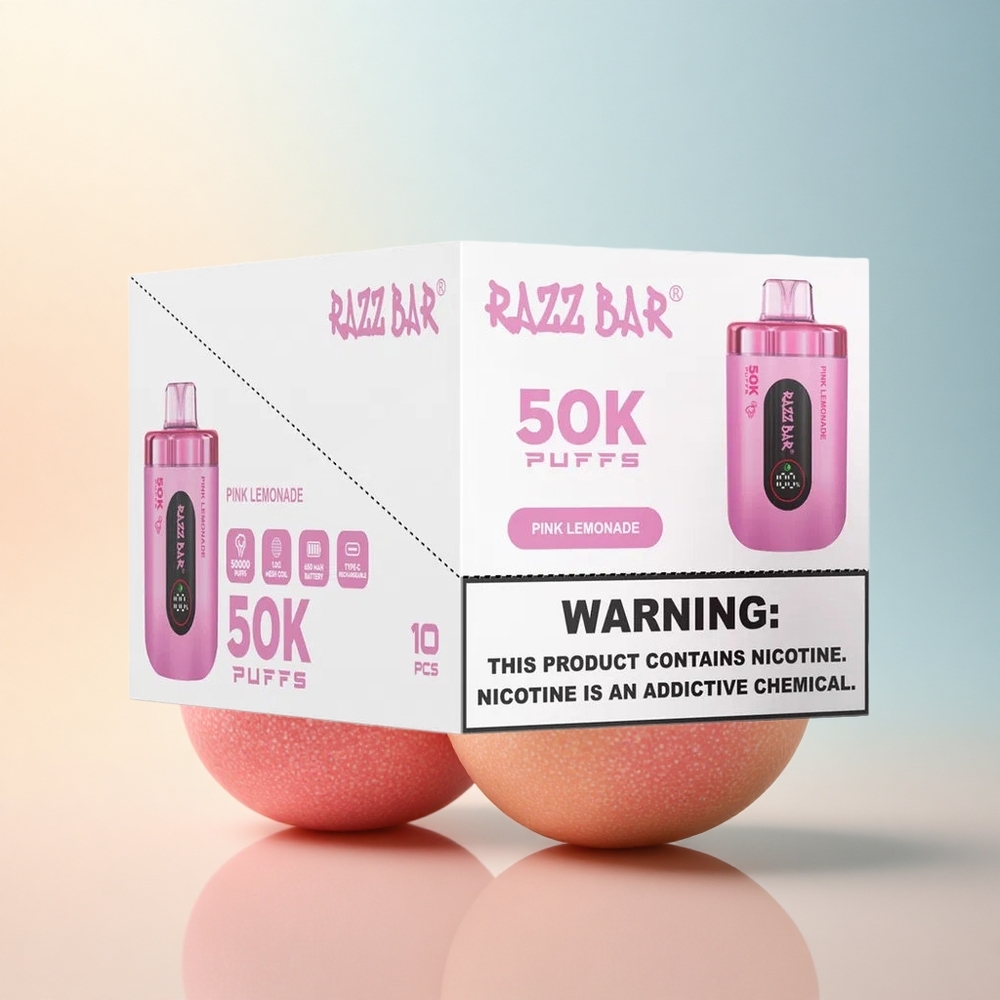 Razz Bar 50K Puffs عصير الليمون الوردي بشريحة شبكية 1.0 أوم ومحتوى نيكوتين 2%